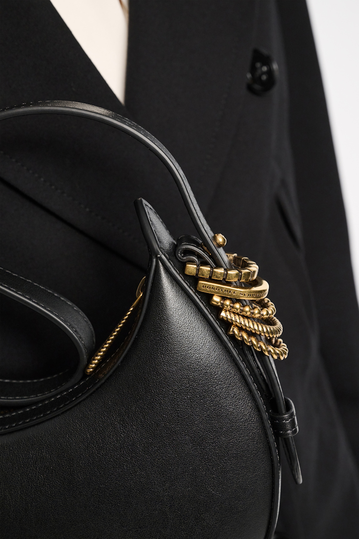 Embracing freedom and individuality. Die Half Moon Mini Bag wird in Italien aus weichem Kalbsleder gefertigt. Das Innenfutter aus Kalbsveloursleder wird durch ein Kartenfach ergänzt. Aufgefächerte D-Rings in unterschiedlichen Texturen vollenden den längenverstellbaren Henkel. Die D-Rings in Vintage Gold verweisen subtil auf die Initialen der Designerin und symbolisieren ein Gefühl von grenzenlosen Möglichkeiten. Die Mini Bag wird mit einem Reißverschluss geschlossen und kann auf der Schulter getragen werden.