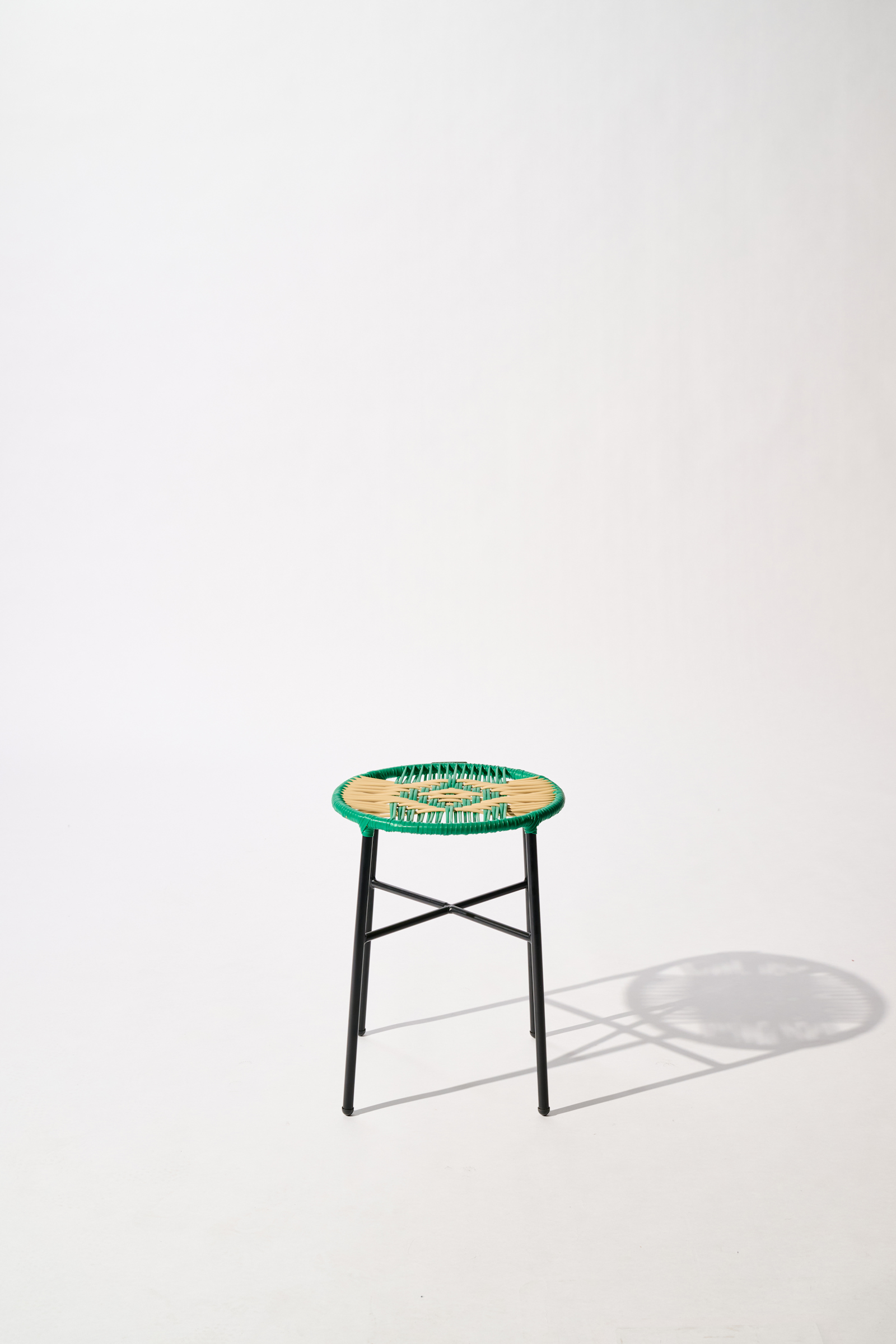 Der "El Banco" Hocker wurde vom Hersteller Tucurinca in Kolumbien von Webern handgefertigt. Das Gestell ist aus pulverbeschichtetem Stahl gefertigt, die Sitzfläche aus handgeflochtenem PVC-Gewebe mit ikonischem Muster. Der Hocker ist für den Innen- oder überdachten Außenbereich vorgesehen.