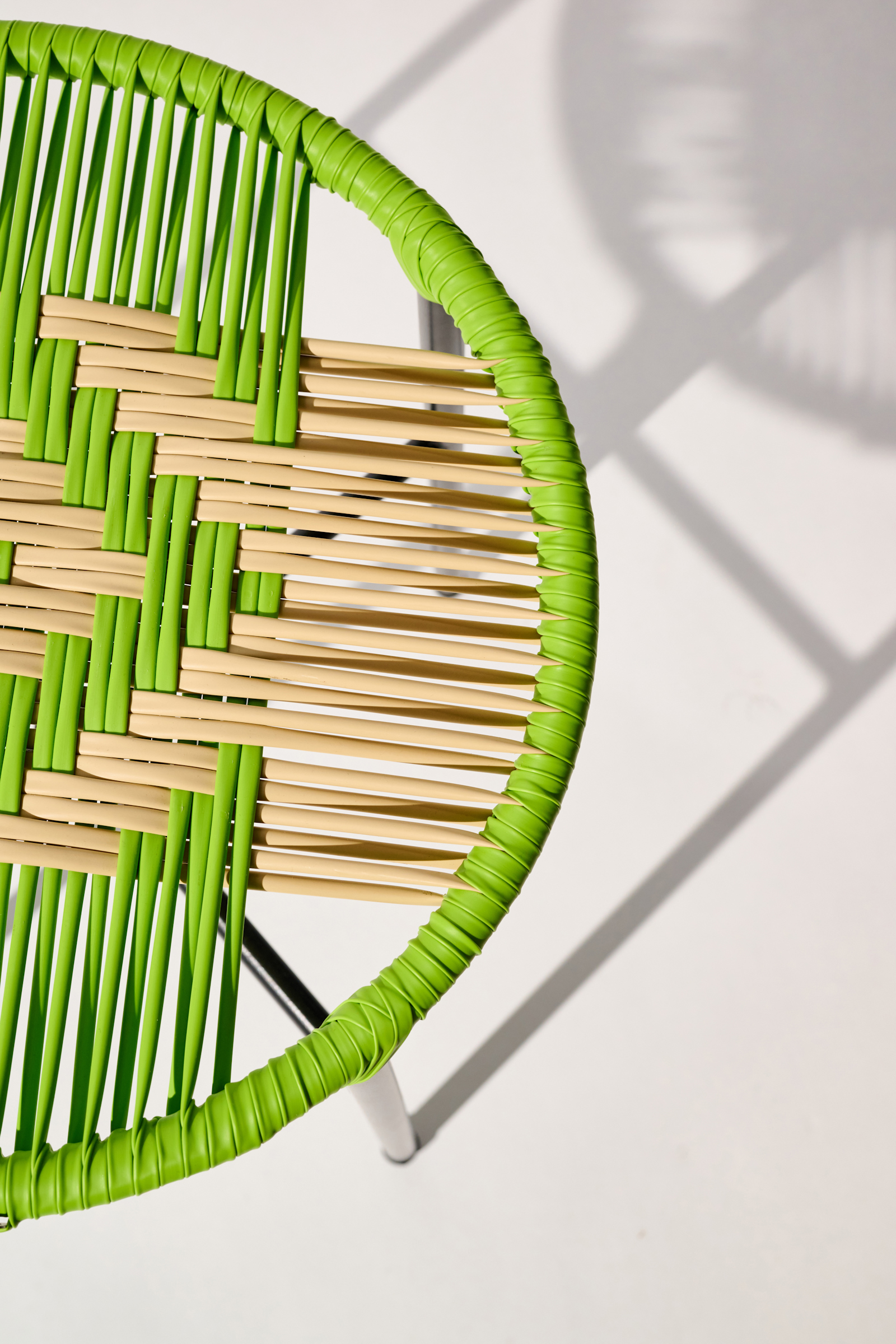 Der "El Banco" Hocker wurde vom Hersteller Tucurinca in Kolumbien von Webern handgefertigt. Das Gestell ist aus pulverbeschichtetem Stahl gefertigt, die Sitzfläche aus handgeflochtenem PVC-Gewebe mit ikonischem Muster. Der Hocker ist für den Innen- oder überdachten Außenbereich vorgesehen.