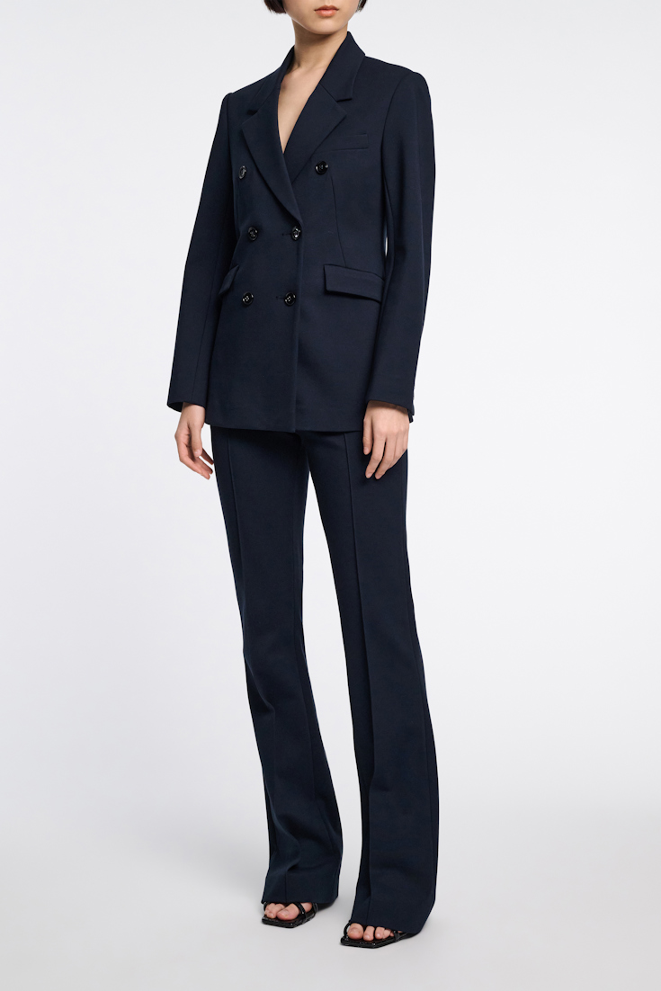 Der doppelreihige Blazer ist aus softem Punto Milano gefertigt. Die figurnahe Silhouette wird durch ein fallendes Revers und schräge Brustabnäher ausgezeichnet. Mit den matching Pants entsteht ein zeitlose Suit-Kombi.