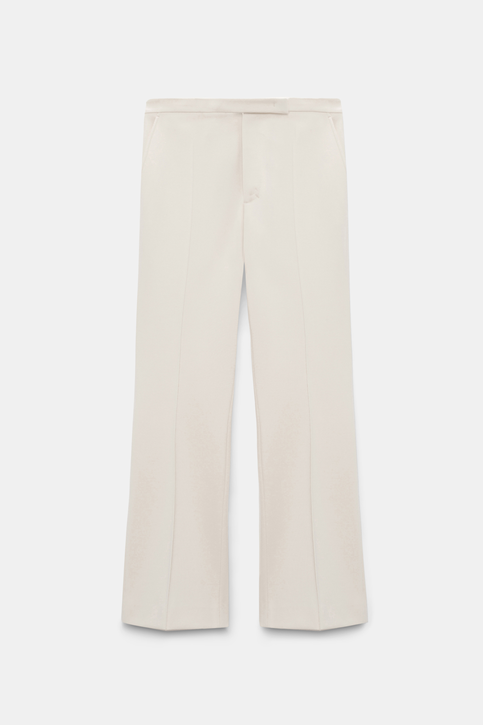 Die Hose ist aus Punto Milano gefertigt. Die figurnahe Silhouette wird durch ein ausgestelltes Bein ergänzt.