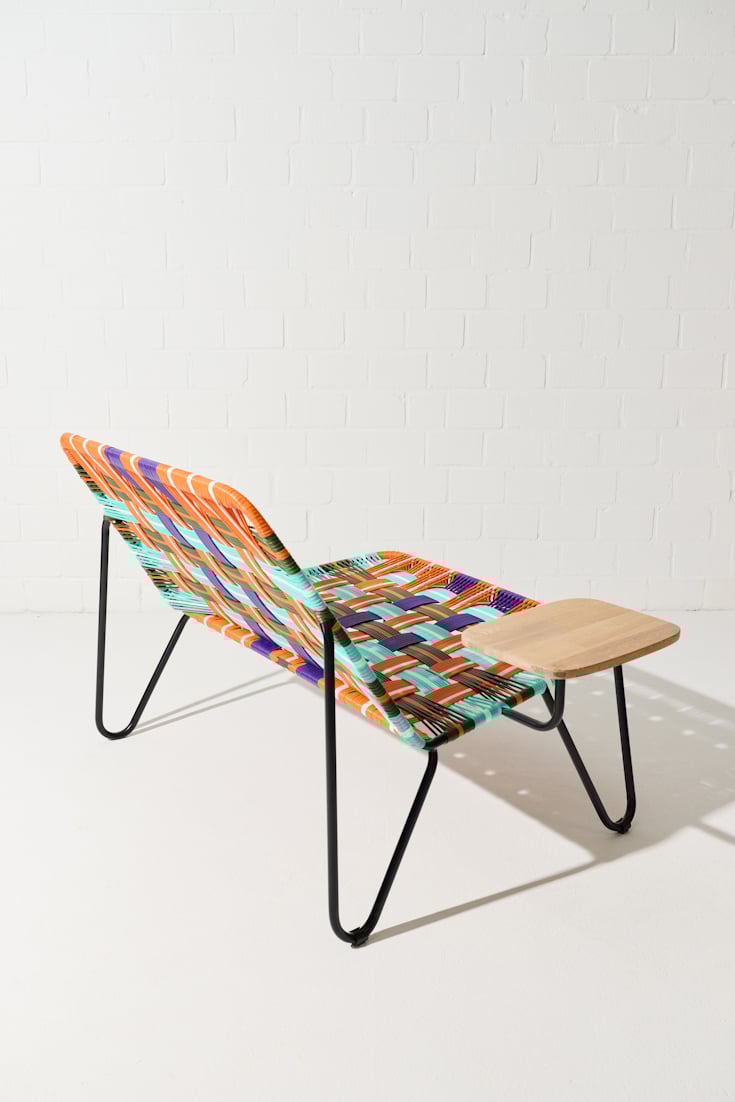 Der "Prii" Love Seat wurde vom Hersteller Tucurinca in Kolumbien von Webern handgefertigt. Das Modell besteht aus einer großzügigen Bank, die durch einen integrierten Holztisch ergänzt wird. Das Gestell ist aus pulverbeschichtetem Stahl gefertigt, die Sitzfläche aus handgeflochtenem PVC-Gewebe mit ikonischem Muster. Der Love Seat ist für den Innen- oder überdachten Außenbereich vorgesehen.