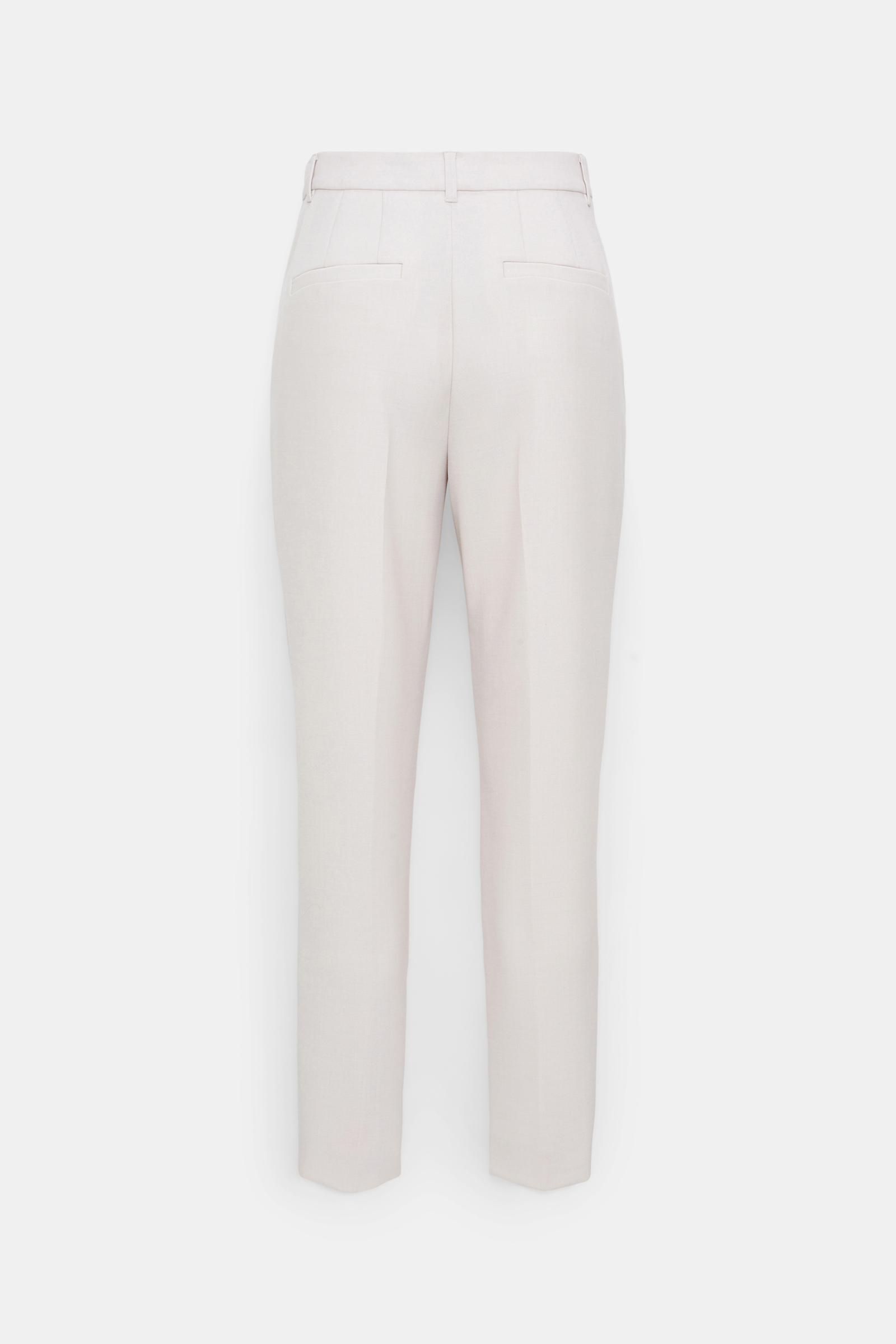 Die Hose ist aus einem Wollmix gefertigt und hat eine zeitlose Zigaretten-Silhouette. Das Bein ist verkürzt und wird durch einen feinen Reißverschluss an der Innenseite ergänzt.