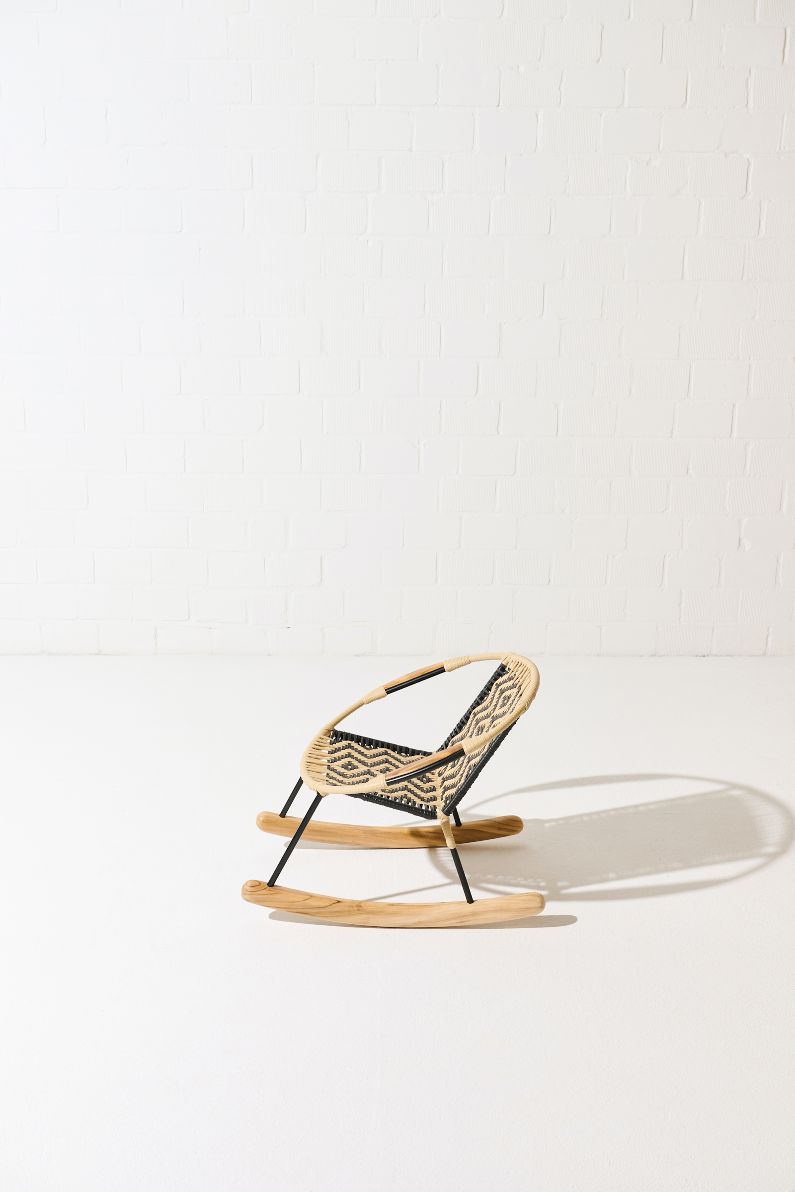 Der "Tucurinquita" Schaukelstuhl wurde vom Hersteller Tucurinca in Kolumbien von Webern handgefertigt und hat die perfekte Größe für Kinder. Das Gestell ist aus pulverbeschichtetem Stahl gefertigt, die Sitzfläche aus handgeflochtenem PVC-Gewebe mit ikonischem Muster. Der Schaukelstuhl ist für den Innen- oder überdachten Außenbereich vorgesehen.
