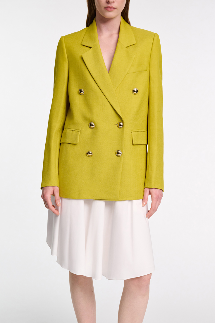 Der Blazer ist aus einem angenehmen Woll-Mix gefertigt und hat eine zweireihige, gerade Silhouette. Goldene Knöpfe zeichnen den Klassiker aus