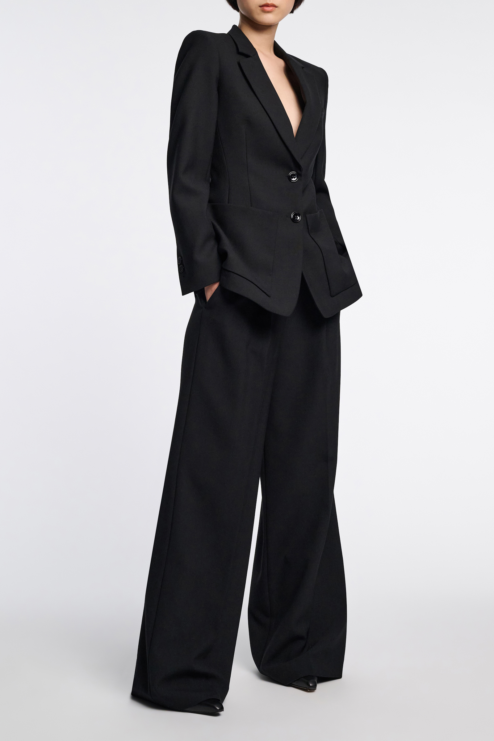 Der einreihige Blazer hat eine taillierte, figurnahe Silhouette. Aufgesetzte, große Taschen treffen auf einen zeitlosen Hourglass-Shape.