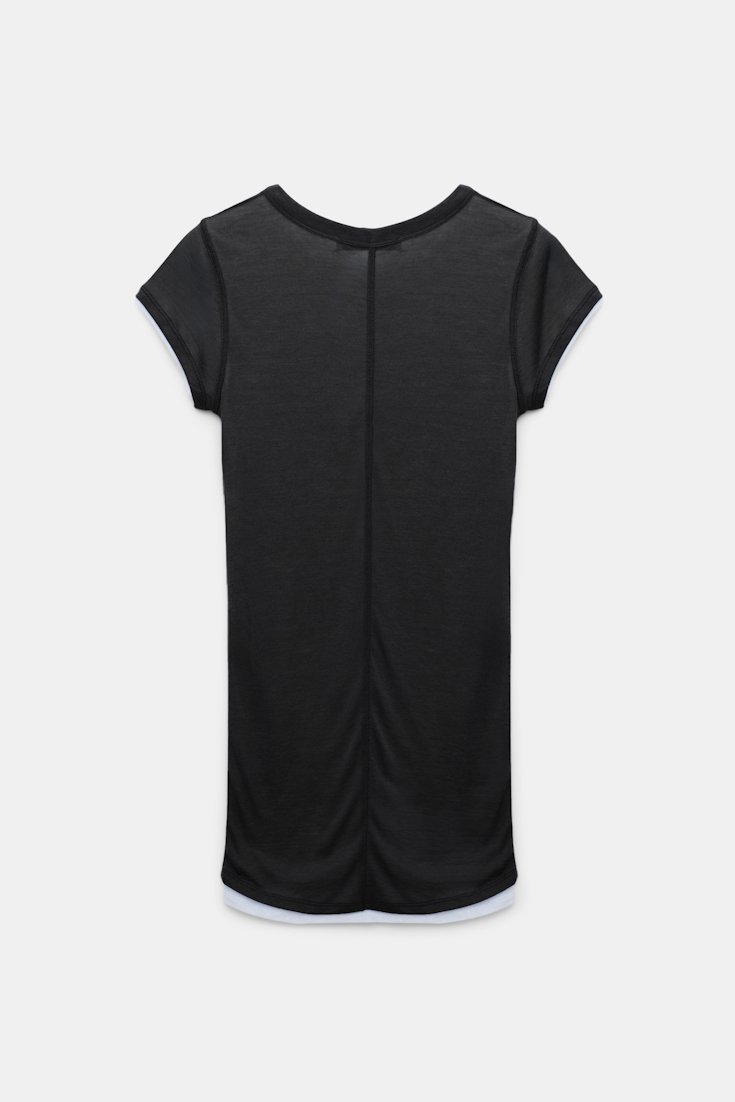 Das T-Shirt ist aus feinem Jersey gefertigt und hat zwei Layers. Das erste, weiße Layer hat einen längeren Saum, der unter dem zweiten Layer hervorblitzt. Das lässige Basic sitzt entspannt und hat einen tiefen Rundhalsausschnitt.