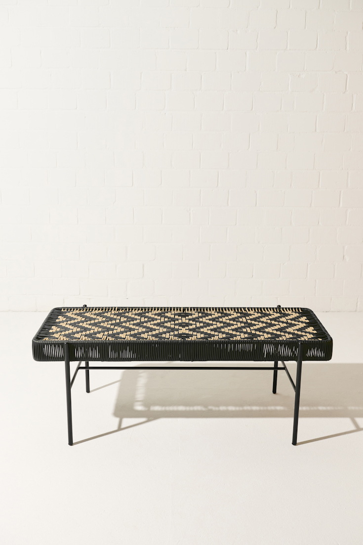 Die "Aichuchi" Banca wurde vom Hersteller Tucurinca in Kolumbien von Webern handgefertigt. Das Gestell ist aus pulverbeschichtetem Stahl gefertigt, die Sitzfläche aus handgeflochtenem PVC-Gewebe mit ikonischem Muster. Die Bank ist für den Innen- oder überdachten Außenbereich vorgesehen.