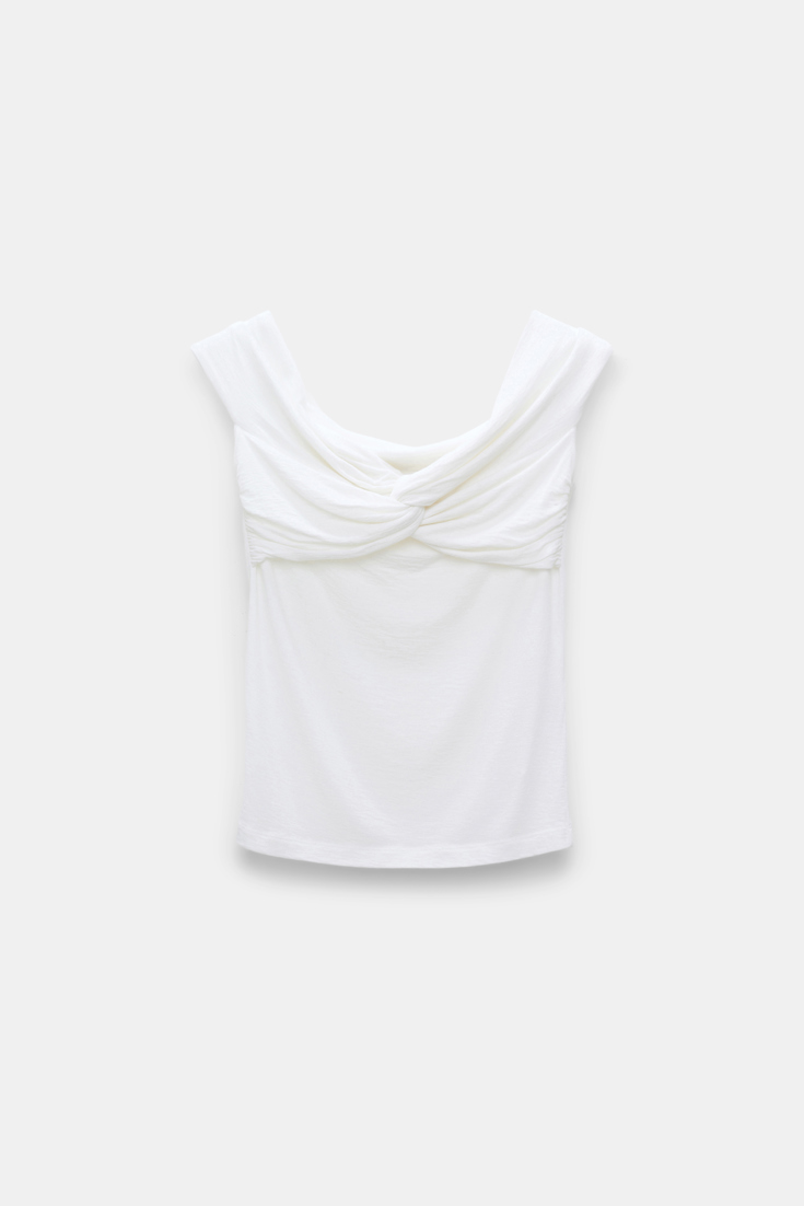 Das drapierte Top ist aus einem elastischen, feinen Jersey gefertigt und hat eine extra softe Haptik. Es zeichnet sich durch ein Knoten-Detail und einen gedoppelten Schulter- und Brustbereich aus.