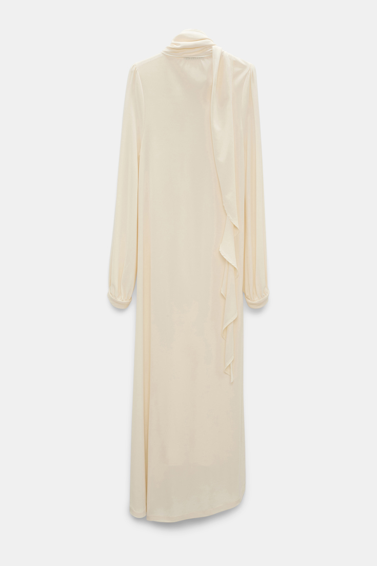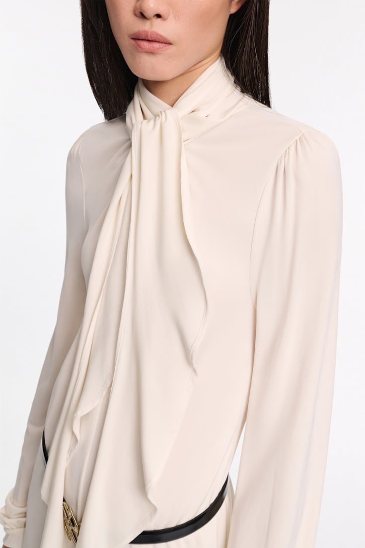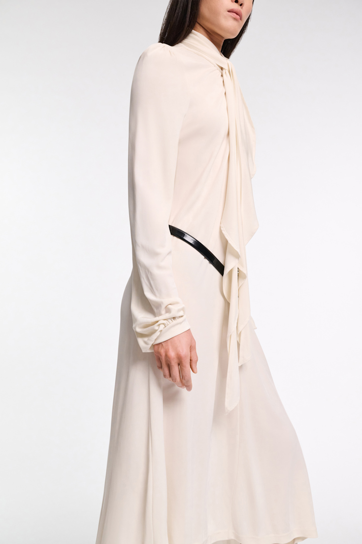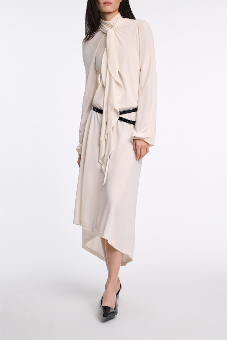Best dressed (guest): Das Kleid aus fließendem Crêpe-Jersey zeichnet sich durch einen drapierten Volant am Halsausschnitt aus, der mit Seiden-Georgette eingefasst ist. Großzügige Blusenärmel mit schmalen Bündchen und Kräusel an der Schulter runden das Modell ab.