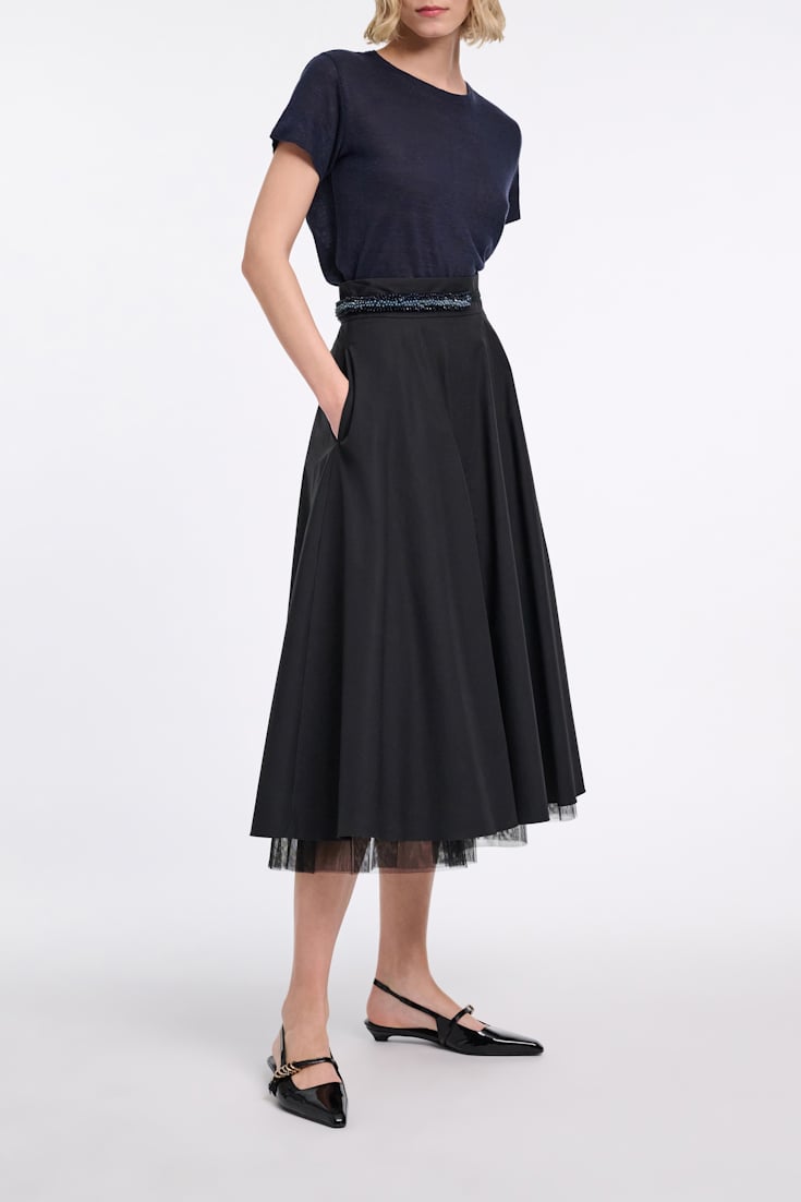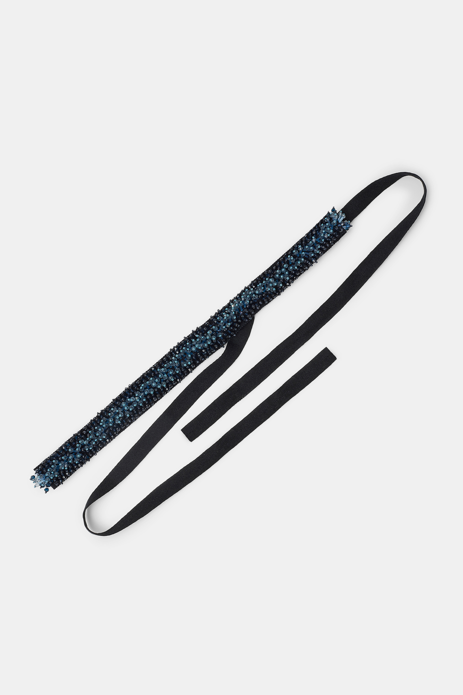 Der Gürtel ist aus Grosgrain- und Baumwollbändern gefertigt und zeichnet sich durch handbestickte Details aus. Der Binde-Verschluss ermöglicht unterschiedliche Stylingmöglichkeiten und kann auch als Haarband gestyled werden.