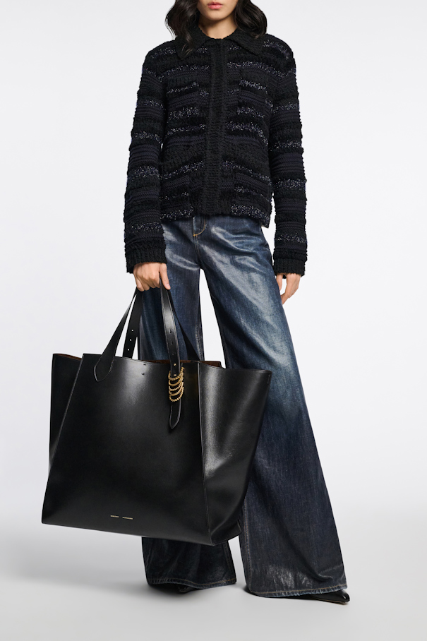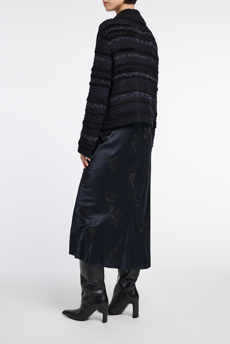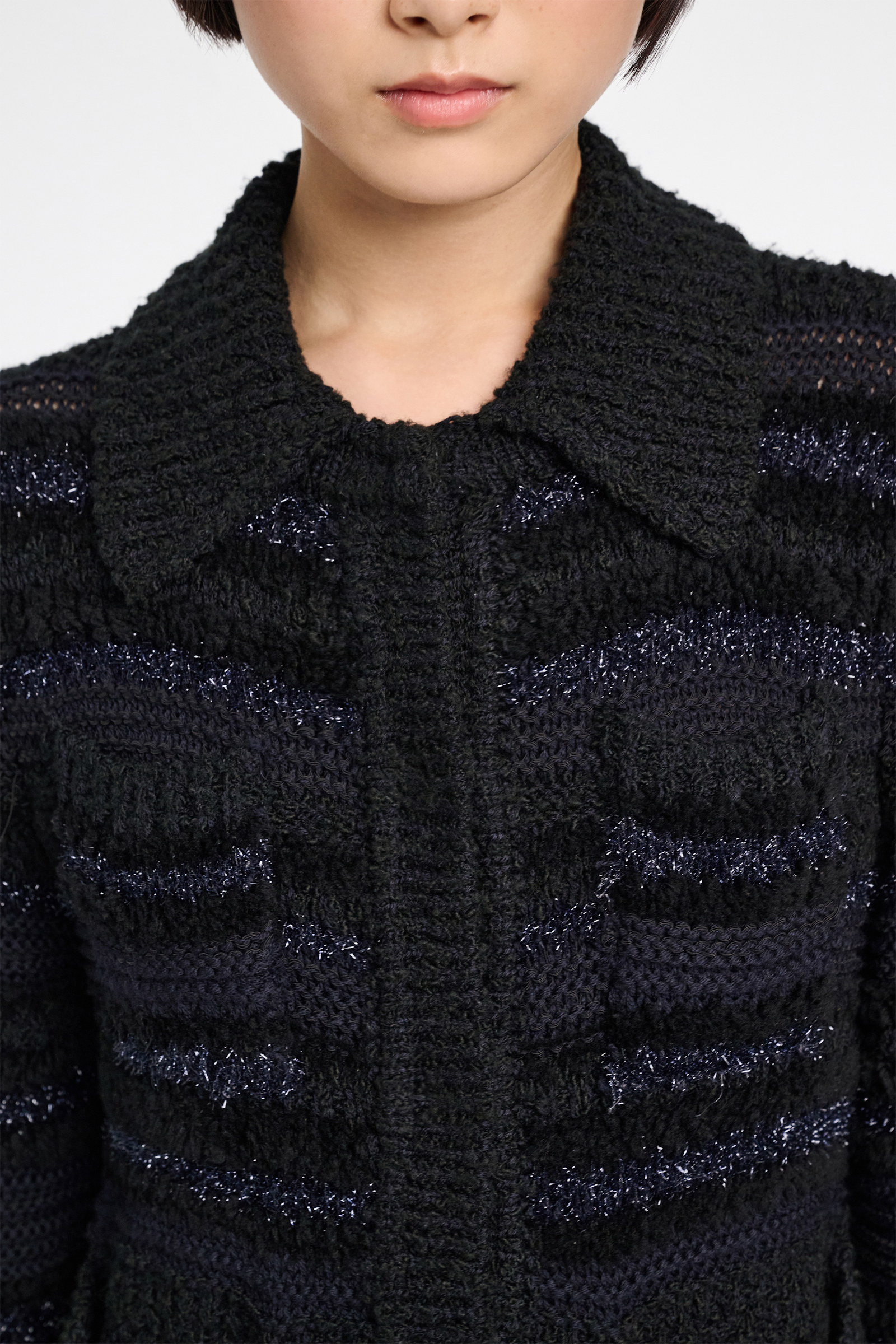 Der Cardigan hat einen verkürzten, boxy Fit und wird durch einen Garnmix ausgezeichnet. Schimmernde Streifen treffen auf Druckknöpfe und aufgesetzte Taschen.