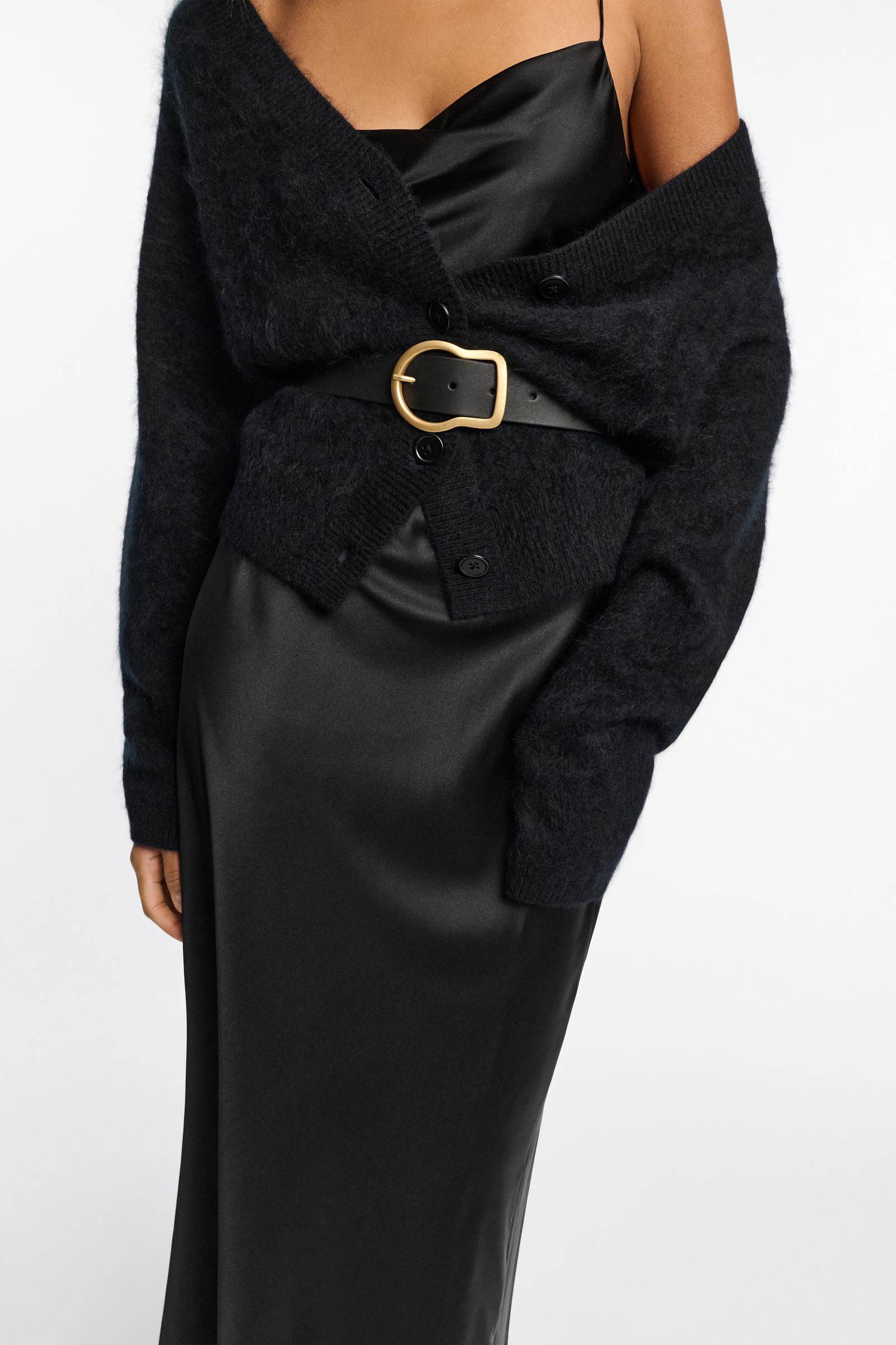 Der Gürtel ist aus softem Kalbsleder gefertigt. Die breite Silhouette wird durch eine Signature-Schließe in mattem Gold ausgezeichnet.