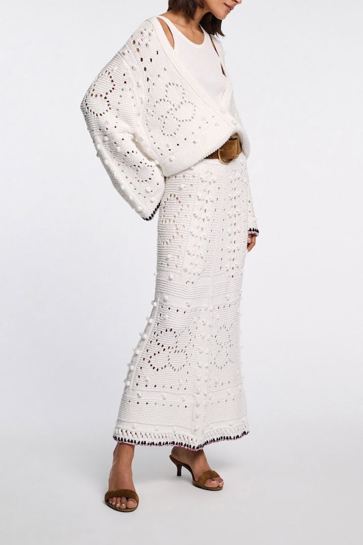 Let's talk details: The V-neck cardigan is knit in a cotton blend and has stitch and D-rose pointelle patterning. The relaxed fit style has contrast crochet trim on the neckline and cuffs.