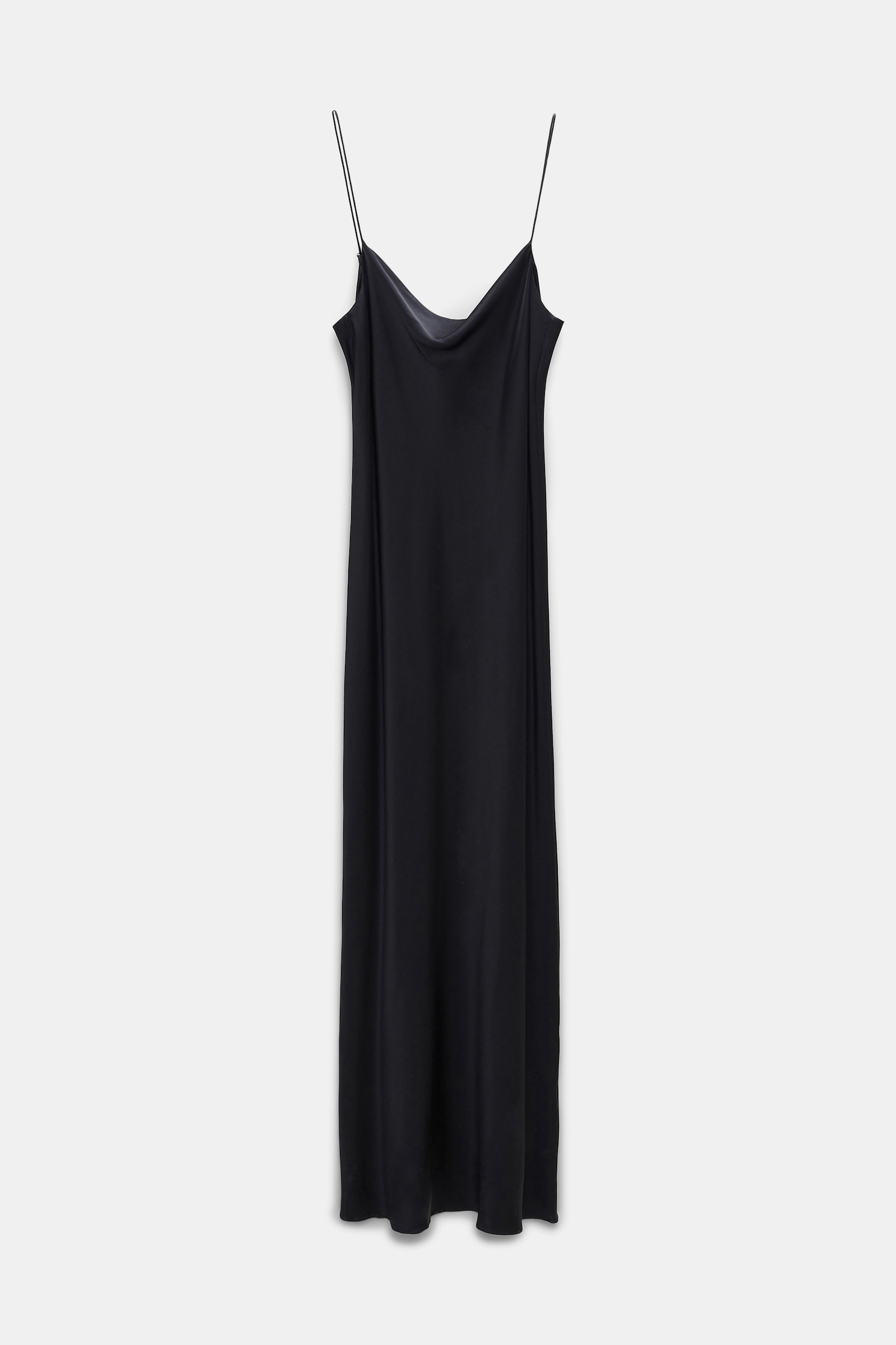 The dress of your dreams: The stretch silk-satin midi dress is cut on the bias and falls in a loosely fitted drape. The dress has a waterfall neckline and thin, adjustable spaghetti straps.