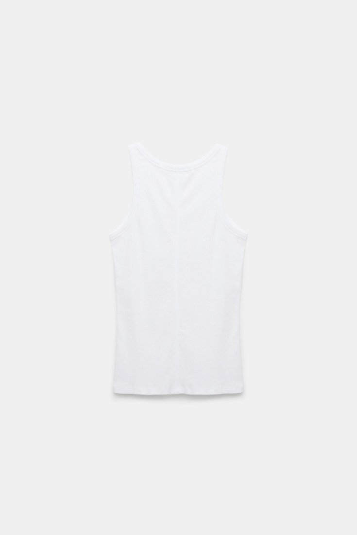 The ribbed cotton tank top has a round scoop neckline and distressed edges.