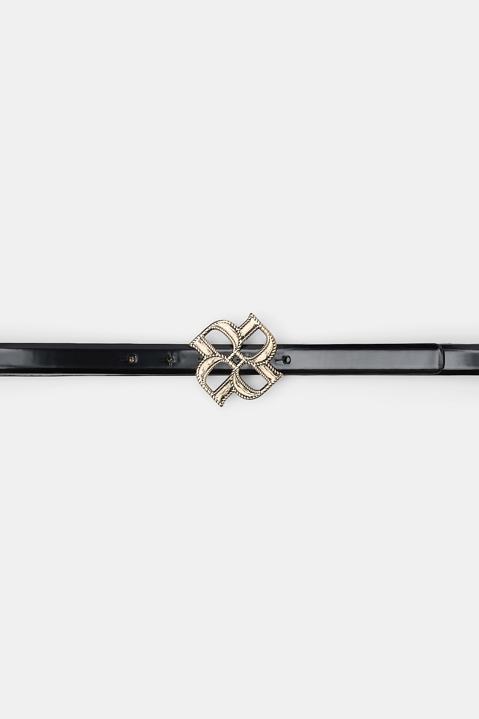 The shiny boxcalf belt has a D-rose buckle and adjustable push stud closure.